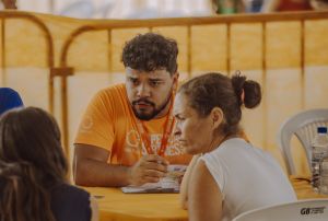 Paulo Kishishita realizando cadastro de mãe e filha durante ação de saúde da SAS Brasil no Sertões 2024. Foto: SAS Brasil