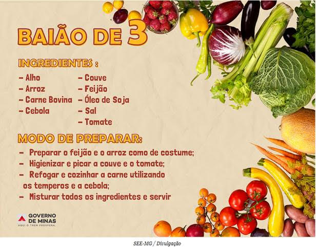 O baião de três de Divinópolis é inspirado na receita tradicional nordestina, com arroz e feijão, e ganha um toque mineiro com couve e carne picadinha. “Eles comem tudo e ainda pedem para repetir. É sucesso garantido”, afirma Nara.